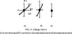 Свет представляет собой совокупность световых волн, излучаемых множеством отдельных атомов, которые излучают световые волны независимо друг от друга, поэтому световые волны со всевозможными равновероятными колебаниями векторов Еi называется естественным (рис. 4.1 а). Свет, в котором существует преимущественная (но не единственная) ориентация колебаний векторов Еi для всех волн называется частично поляризованным (рис. 4.1 б). Степень поляризации света определяется выражением: