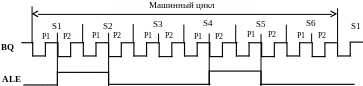 OSC/2 - основная внутренняя тактовая частота CLK. Первая половина периода CLK - фаза P1, вторая - P2. Каждый машинный цикл состоит из шести периодов CLK: состояний S1, S2, .. S6 или двенадцати периодов OSC, называемых фазами S1P1, S1P2, S2P1, .. S6P, S6P2. Каждый машинный цикл сопровождается генерацией двух стробов ALE длительностью в один период CLK - S1P2..S2P1, S4P2.. S5P1 (Рис. 11 .96).