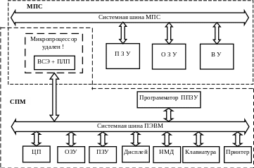 В состав СПМ входят аппаратные и программные средства, позволяющие вести отладку ПО МПС на базе ЦП СПМ, ее памяти и ВУ. Подготовленная таким образом программа - объектный модуль - может быть загружена непосредственно в ППЗУ, но прежде она может быть запущена на реальной отлаживаемой МПС непосредственно из ОЗУ СПМ через ВСЭ.
