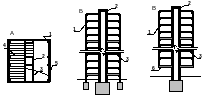 А –план; Б – опирание колонн на собственный фундамент; В – опирание колонн на жесткие консоли. 1 – колонны; 2 – ядро жесткости; 3 – ригели; 4 – плиты перекрытий; 5 – навесные стены; 6 – жесткие консоли.