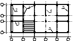 Сосредоточенное расположение диафрагм жесткости в плане каркасного здания. 1 – колонны каркаса; 2 - ригели поперечных рам; 3 – навесные стены; 4 – ствол (ядро жесткости).
