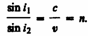 Для вывода закона преломления предположим, что плоская волна (фронт волны — плоскость AВ), распространяющаяся в вакууме вдоль направления I со скоростью света с, падает на границу раздела со средой, в которой скорость ее распространения равна v (рис. 244). Пусть время прохождения волной пути ВС равно t. Тогда BC=ct. За это же время фронт волны, возбуждаемый точкой A в среде со скоростью v, достигнет точек полусферы, радиус которой AD=vt. Положение фронта преломленной волны в этот момент времени в соответствии с принципом Гюйгенса задается плоскостью DC, а направление ее распространения — лучом III. Из рис. 244 следует, что AC=BC/sini1=AD/sini2, т. е. ct/sini1=vt/sini2c, откуда