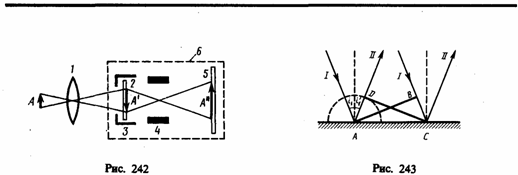 Выведем законы отражения и преломления света, исходя из принципа Гюйгенса. Пусть на границу раздела двух сред падает плоская волна (фронт волны — плоскость AВ), распространяющаяся вдоль направления I (рис. 243). Когда фронт волны достигнет отражающей поверхности в точке A, эта точка начнет излучать вторичную волну. Для прохождения волной расстояния ВС требуется время t=BC/v. За это же время фронт вторичной волны достигнет точек полусферы, радиус AD которой равен vt=BC. Положение фронта отраженной волны в этот момент времени в соответствии с принципом Гюйгенса задается плоскостью DC, а направление распространения этой волны — лучом II. Из равенства треугольников AВС и ADС вытекает закон отражения: угол отражения i’1, равен углу падения i1.
