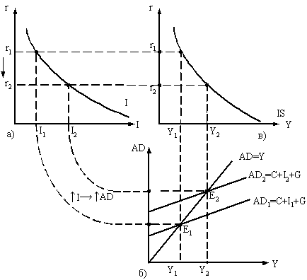 Согласно Кейнсу, равновесие на рынке товаров определяется AD= Y. Таким образом, денежный и товарный рынки взаимосвязаны через Y, I, r (рис. 35.1, а-в).