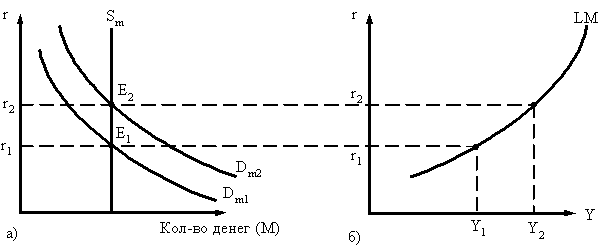Денежный рынок. Рост национального дохода (Y1->Y2) увеличивает рост спроса на деньги (Dm1 -> Dm2). При неизменном предложении денег (Sm) это приводит к росту r (рис. 35.2,а). Таким образом, при национальном доходе Y2 (рис. 35.2,б).