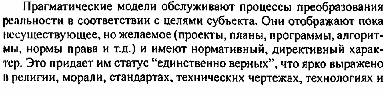 Прагматические модели являются как бы стандартом, образцом, носят нормативный характер. Под эти образцы «подгоняются» как сама деятельность, так и ее результат. Примеры: ССБТ, СНиПы, кодексы законов, уставы организаций, планы и программы действий, рабочие чертежи, шаблоны, технические допуски, экзаменационные требования и др.