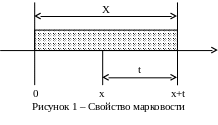 Рассмотрим длительность времени X как феномен, говорят время обслуживания, и отметим начало этой генерации (см. рис.1). Тогда, если феномен Х распределен экспоненциально с математическим ожиданием –1, то вероятность того, что феномен продолжится и после момента времени х определяется как