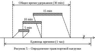Рассмотрим пример. Предположим, что на СМО поступили 3 вызова в час со временем удержания, соответственно, 5, 10 и 15 минут (см. рис. 5). Отсюда транспортная нагрузка вычисляется как
