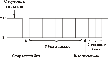 Интерфейс RS-232C предназначен для подключения к компьютеру стандартных внешних устройств (принтера, сканера, модема, мыши и др.), а также для связи компьютеров между собой. Основными преимуществами использования RS-232C по сравнению с Centronics являются возможность передачи на значительно большие расстояния и гораздо более простой соединительный кабель. В то же время работать с ним несколько сложнее. Данные в RS-232C передаются в последовательном коде побайтно. Каждый байт обрамляется стартовым и стоповыми битами. Данные могут передаваться как в одну, так и в другую сторону (дуплексный режим).