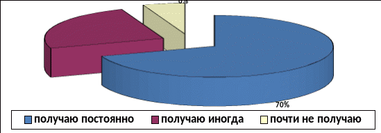 На вопрос «Получаете ли Вы от родителей материальную поддержку?» получаю постоянно ответило 37 студентов (69,8%), получаю иногда – 13 студентов (24,5%)), почти не получаю – 3 человека (5,7%). Из 53 испытуемых ни один студент не может существовать без родительской поддержки (Рис.5.).