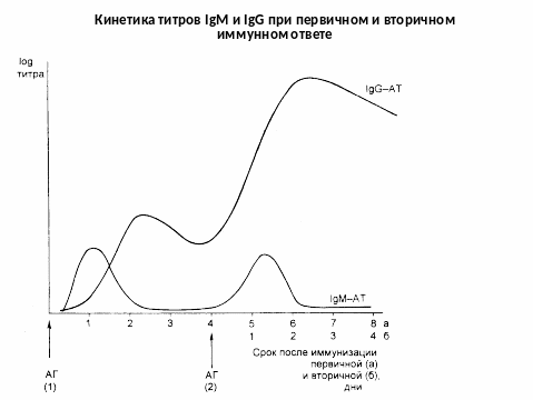 Особенность первичного иммунного ответа – низкая скорость антителообразования и появление сравнительно невысоких титров АТ.