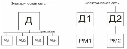Групповой электропривод обеспечивает движение нескольких рабочих машин или нескольких исполнительных механизмов (ИМ) рабочей машины. Передача механической энергии от одного двигателя к нескольким рабочим машинам и её распределение между ними производится с помощью трансмиссий. Такой групповой электропривод называют также трансмиссионным (рис. 1.2). Другая разновидность группового электропривода – это установка на каждую рабочую машину своего электродвигателя. Однако при этом сохраняется система распределения механической энергии внутри машины между исполнительными механизмами (рис. 1.3).