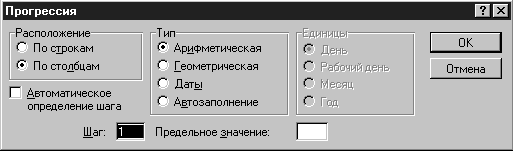 Наиболее интересным параметром в окне диалога “Прогрессия” является флажок Автоматическое определение шага. Если он установлен, то вычисляется значение шага, опираясь на значения в верхних или левых ячейках выделения, для создания наиболее близкой к ряду прямой (для линейного тренда) или экспоненциальной линии (для экспоненциального тренда). При установке этого флажка значение из поля ввода Шаг игнорируется.