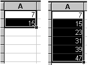 Можно построить ряд данных и другим способом, если указать шаг построения. Для этого нужно ввести вручную второй член будущего ряда, выделить обе ячейки и затем, воспользовавшись тем же правым-нижним углом выделения, продолжить выделение до нужной области. Две первых ячейки, введенные вручную, задают шаг ряда данных.