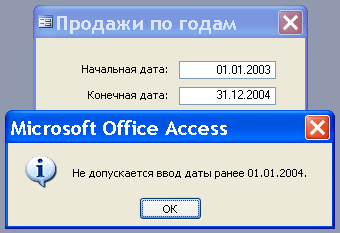 При попытке ввести дату, предшествующую 1 января 2004 г., будет отображено сообщение об ошибке. После нажатия кнопки ОК фокус вновь будет установлен на это поле.