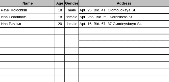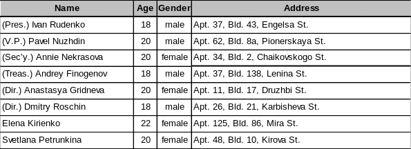ФИО, пол, возраст и домашний адрес каждого члена клуба на момент учреждения в соответствии с занимаемыми должностями;