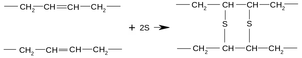 При повышенных температурах натуральный каучук взаимодействует с серой, превращаясь в резину. Этот процесс носит название вулканизации. При вулканизации за счет раскрытия двойных связей полимера и образования сульфидных мостиков образуются поперечные связи между линейными макромолекулами и структура из линейной превращается в сшитую. При этом повышается модуль упругости, прочность вулканизатов на раздир, но утрачивается способность к растворению и плавлению. Химизм процесса вулканизации можно представить схемой:
