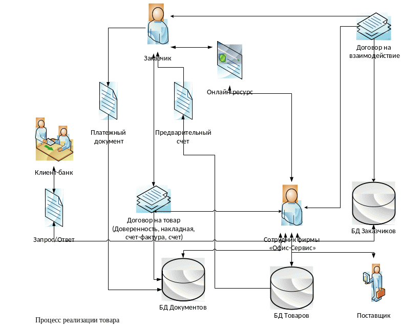 Фирма проверяет данные о заказчике в БД, после чего если его там нет, то запрашивает данные у заказчика. После заключается договор на взаимодействие, а после вносит его в БД. Эти данные используется при составлении договора на товар. Договор на товар после подписания заносится в БД Документов. Заказчик оплачивает товар и представляет платежный документ. Фирма сверяет платежный документ с программой Клиент-банк. И после заносит платежный документ в БД Документов и отправляет товар.