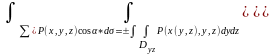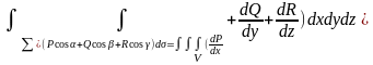 Формула Остроградского. Пусть V-ограниченая область, граница которой состоит из конечного числа кусочно-гладких поверхностей. Пусть ф-ции P,Q,R и их частные производные dP/dx; dQ/dy; dR/dz непрерывны в замкнутой области V, тогда справедливо следуещее равенство: