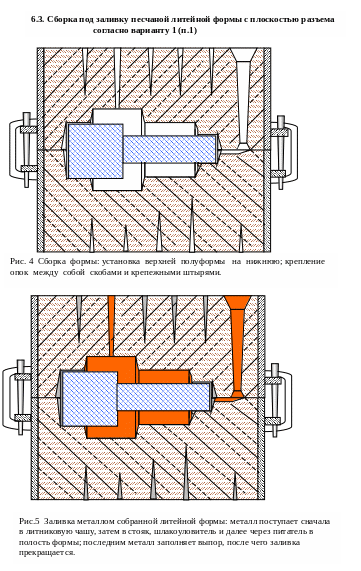 9. Заливка металлом маленьких форм (размером примерно 300х300) производится методом стопочной заливки: готовые собранные формы устанавливаются друг на друга с поворотом, так, чтобы обеспечить доступ к заливочной воронке. Благодаря такому приему заливка примерно 7-ми –10-ти форм может производиться из одного положения.
