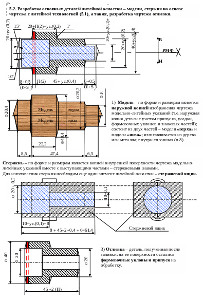 На основании чертежа с литейной технологией определяются форма и размеры модели, стержня и будущей отливки.