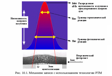 Рис. 10.1 иллюстрирует процесс формирования дорожки записи. Используемый здесь материал имеет максимальную чувствительность к излучению с длиной волны 405 нм. Такая длина волны близка к длине волны излучения газовых лазеров, которые применяются для записи оптических дисков в форматах CD и DVD. Здесь используется объектив с числовой апертурой 0,95 – такой же, как в обычных системах мастеринга. Изменение фазового состояния используемого в данной технологии неорганического резистивного материала происходит в результате термохимической, а не фотохимической реакции, как в обычном неорганическом фоторезисте. Поэтому кристаллизация материала происходит только в зоне, где интенсивность лазерного излучения выше границы термохимической реакции. Следовательно, размеры меток получаются значительно меньше диаметра записывающего пятна.