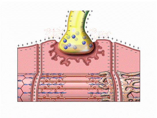 Когда нервный импульс достигает окончания аксона, на деполяризованной пресинаптической мембране открываются потенциалзависимые Са2+ каналы. Вход Са2+ в аксональное расширение (пресинаптическую мембрану) способствует высвобождению химических нейромедиаторов, находящихся в виде везикул (пузырьков) из окончания аксона. Медиаторы (в нервно-мышечном синапсе это всегда ацетилхолин) синтезируются в соме нервной клетки и путем аксонального транспорта транспортируются к окончанию аксона, где и выполняют свою роль. Медиатор диффундирует через синаптическую щель и связывается со специфическими рецепторами на постсинаптической мембране. Так как медиатором в нервно-мышечном синапсе является ацетилхолин, то рецепторы постсинаптической мембраны называют холинорецепторами. В результате этого процесса на постсинаптической мембране открываются хемочувствительные Nа+-каналы, возникает деполяризация, величина которой различна, и зависит от количества выделенного медиатора. Чаще всего возникает локальный процесс, который называют потенциалом концевой пластинки (ПКП). При повышении частоты стимуляции нервного волокна, усиливается деполяризация пресинаптической мембраны, а, следовательно, возрастает количество выделяемого медиатора и число активированных хемочувствительных Nа+каналов на постсинаптической мембране. Таким образом, возникают ПКП, которые по амплитуде деполяризации суммируются до порогового уровня, после чего, на мембране мышечного волокна, окружающей синапс , возникает ПД, который обладает способностью к распространению вдоль мембраны мышечного волокна. Чувствительность постсинаптической мембраны регулируется активностью фермента – ацетилхолинэстеразы (АЦХ-Э), который гидролизует медиатор АЦХ на составные компоненты (ацетил и холин) и возвращает назад – в пресинаптическую бляшку для ресинтеза. Без удаления медиатора на постсинаптической мембране развивается длительная деполяризация, которая ведет к нарушению проведения возбуждения в синапсе – синаптической депрессии. Таким образом, синаптическая связь обеспечивает одностороннее проведение возбуждения с нерва на мышцу, однако на все эти процессы расходуется время (синаптичекая задержка), что приводит к низкой лабильности синапса по сравнению с нервным волокном. Таким образом, нервно-мышечный синапс является «выгодным» местом, куда можно воздействовать фармакологическими препаратами, изменяя чувствительность рецептора, активность фермента. Эти явления будут часто встречаться в практике врача: например, при отравлении токсином ботулизма – блокируется высвобождение медиатора АЦХ (разглаживание морщин в косметической медицине), блокада холиноререпторов (курареподобными препаратами, бунгаротоксином) нарушает открытие Nа+ каналов на постсинаптической мембране. Фосфоорганические соединения (множество инсектицидов) нарушает эффективность АЦХ-Э и вызывает длительную деполяризацию постсинаптической мембраны. В клинике используют специфические блокаторы нервно-мышечного проведения: блокада холинорецепторов курареподобными препаратами, сукцинилхолином и другими конкурентными ингибиторами, вытесняющими АЦХ с холинорецептора. При заболевании миастении из-за дефицита холинорецепторов на постсинаптической мембране (из-за их аутолитичес