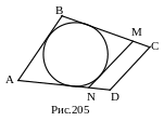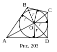 Пусть в четырехугольник АВСD нельзя вписать окружность. Однако окружность, касающаяся трёх сторон четырёхугольника существует (рис. 199).