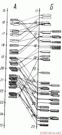 Рис. 51. Схема положения гортани (голосовых связок) у профессиональных певцов по отношению к шейным позвонкам, обозначенным цифрами 4, 5, 6, 7. Каждая полоска соответствует голосовым связкам одного из обследованных певцов. Слева (А) — уровень покойного положения, справа (Б) —. уровень в пении у тех же певцов. Полоски, подчеркнутые черной линией внизу, условно обозначают драматический, более низкий характер голоса. Видно, что если в покое гортани певцов располагаются в области от середины пятого до нижнего края шестого позвонка, причем у женщин несколько выше, чем у мужчин, то в пении диапазон их смещений велик, простираясь от середины четвертого до нижнего края седьмого позвонков. Все басы и баритоны опустили гортань в пении, все легкие сопрано ее подняли или оставили на месте. У теноров и мецпосопрано наблюдается разнобой в положении гортани. Так, например, заслуженная артистка РСФСР, лирико-колоратурное сопрано Н. сообщила, что в период обучения педагог пытался в течение некоторого времени заставить ее опускать гортань во время пения. В результате этого приема пение затруднилось, начал изменяться к худшему тембр, стало тяжелее брать ноты верхнего регистра, крайние ноты диапазона пропали. Педагог не был догматиком, своевременно отошел от этого приема, перестал вмешиваться в положение гортани, опускать ее, и прежняя легкость звукообразования, лучшие качества тембра и предельные верхние ноты возвратились. Этот случай показывает, что насилие над природой вредно для развития вокальных данных, что педагогическое воздействие должно быть гибким. Прежде всего педагог должен заниматься поисками наилучших качеств звучания голоса. Как показали рентгеновские исследования,— данная певица пользовалась в пении сильно повышенным положением гортани, что создавало наилучшие возможности для проявления вокальных качеств ее голоса. Баритон Н., ведущий солист Большого театра, рассказал, что в период обучения в музыкальном училище он неожиданно стал терять голос. Стало трудно петь, голос стал «качаться», детонировать, стали пропадать верхние ноты. Положение было катастрофическим и педагог не знал, как помочь. Педагог другого класса указал на то, что певец стал поднимать гортань, и посоветовал держать ее низко. Воспользовавшись этим советом и применив прием опускания гортани, баритон Н. быстро восстановил утраченные качества своего голоса. Конечно, он считает теперь этот прием основным в вокальной педагогике. Это ему принадлежат слова: «Кто не опускает гортань — тот не певец». В данном случае, так же как и в первом, несвойственное данному певцу положение гортани привело к деградации голоса, и наоборот, возвращение к верной ее установке, к восстановлению его лучших качеств. Очевидно, что положение гортани в пении определяется не столько системой обучения, сколько нахождением наиболее удобной, с точки зрения голосового аппарата поющего, установки, зависящей от каких-то иных явлений в голосовом аппарате. Если система педагога удовлетворяет этим требованиям, — голос хорошо развивается, если нет, — голос деградирует. Что же наиболее кардинально меняется при изменении положения гортани? Задали мы этот вопрос пытаясь найти объяснение установленному нами явлению разнообразия положения гортани в пении профессиональных певцов. Решительно меняю