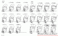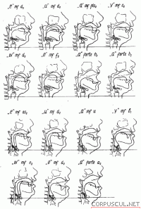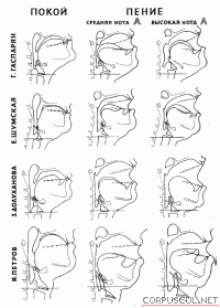 Под каждым речевым звуком помещен соответствующий певческий для того, чтобы было легче сравнить, что изменилось в приспособлении гортани и органов надставной трубки при переходе от речи к пению. На схемах видно, что речевые положения гортани не совпадают с певческим (у данных певцов речь — на повышенной, а пение — на пониженной гортани), и что певческое положение у профессионального певца единообразно на всех гласных и не меняется на высоких нотах.