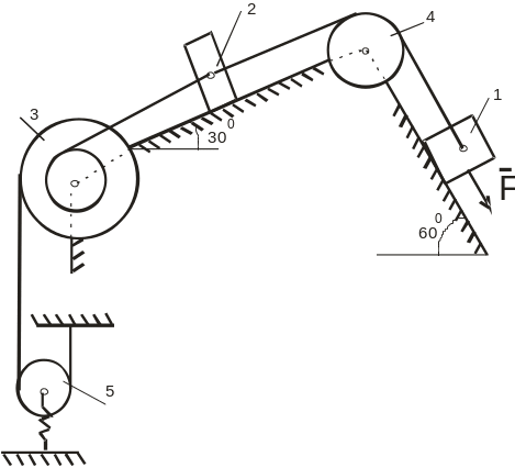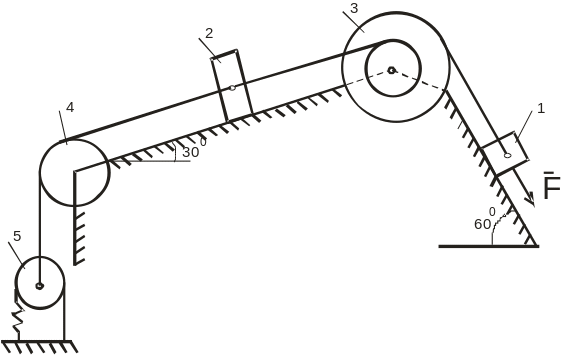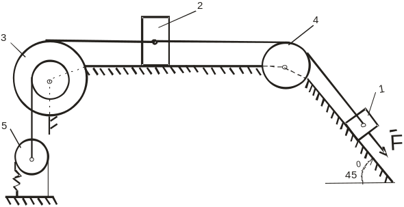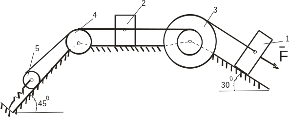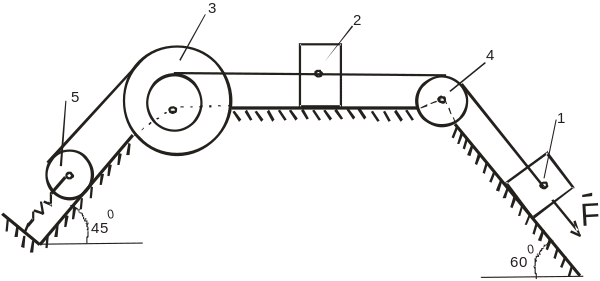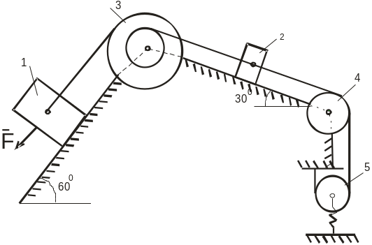 Под действием силы F=f(s), зависящей от перемещения s точки ее приложения, система приходит в движение из состояния покоя; деформация пружины в момент начала движения равна нулю. При движении на шкив 3 действует постоянный момент M сил сопротивления (от трения в подшипниках).