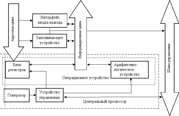 Организация вычислителя в большинстве случаев описывается моделью фон Неймана (рисунок 2.10). Здесь можно выделить операционное устройство (т.е. исполнительную часть вычислителя), устройство управления, запоминающее устройство (ЗУ), интерфейс ввода-вывода и генератор. Устройства соединены между собой шинами.