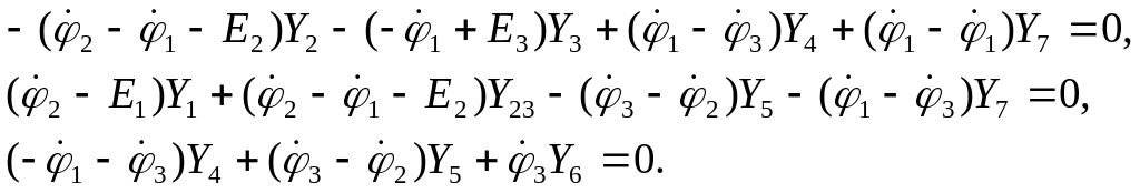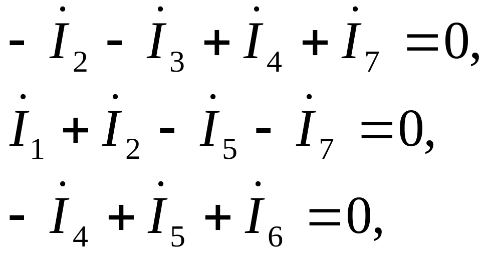 Таким чином, замість семи невідомих струмів можна шукати всього три невідомих потенціали, знаючи які, легко знайти всі струми. Щоб одержати рівняння для визначення потенціалів, запишемо для вузлів 1, 2, 3 рівняння за першим законом Кірхгофа і замінимо в них струми через потенціали вузлів із /4.3/: