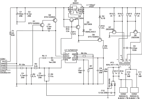 Как правило, на экране блок контроля, ШИМ и блок управления яркостью объединены в одной микросхеме. Преобразователь выполняется на дискретных элементах с нагрузкой в виде импульсного трансформатора, дополнительная обмотка которого используется для коммутации запускающего напряжения.