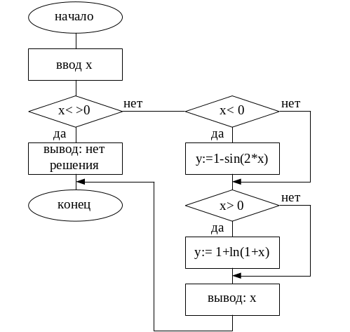 Program variant 19 Uses Crt Var x, y:real; Begin Clrscr; write (‘введите х=’); read(x); fx<>0 then Begen fx<0 then y:=1-sin(2*x); fx>0 then y:=1+ln(1+x); writeln (‘y=’, y:3:3); and else writeln (‘решения нет’); repeat until keypressea;