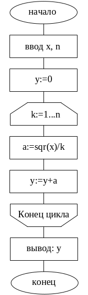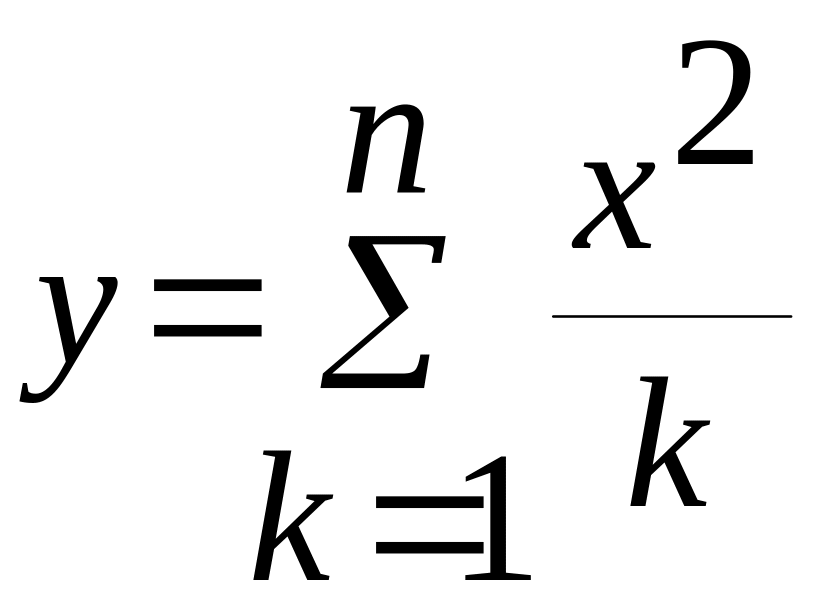 Program 1; Uses Crt; Var n, k: integer; x,y,a: real; Begin Clrscr write (‘Введите значение х =’); read(x); write (‘Введите значение n =’); read (n) y:=0 for k:=1 to n do Begin a:=sqr(x)/k; y:=y+a end; writeln (‘y=’, y:3:3); repeat until keypressed end.