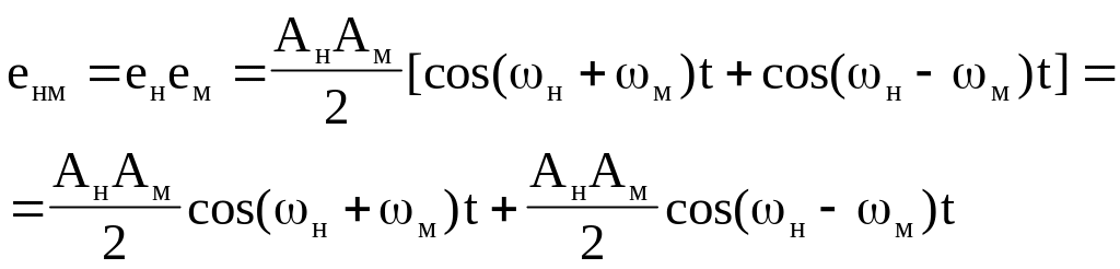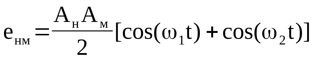 Уравнение (4a) представляет собой сигнал, состоящий из двух колебаний с частотами 1=н+м и 2=н-м и амплитудами АнАм/2. Переписывая выражение для модулированного колебания (4a), получим