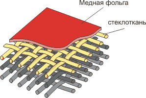 Заготовки для жестких печатных плат представляют собой несколько спрессованных слоев стекловолокна (обычно 8 слоев), покрытых медной фольгой. Пространство между слоями заполнено наполнителем. Самый простой способ расположения стеклянных волокон - когда они перпендикулярны друг другу. При различной ориентации волокон в слоях прочностные характеристики материала становятся одинаковыми по всем направлениям. Толщина материала оценивается без учета медной фольги. Толщина фольги одинакова с обеих сторон.
