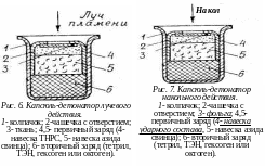 На рис. 6 показано устройство комбинированного капсюля-детонатора лучевого действия. Капсюль-детонатор состоит из колпачка 1, чашечки 2 с отверстием, прикрытым кружком из шелковой ткани 3, первичного заряда 4 и 5 и вторичного заряда 6. Первичный заряд имеет навеску 4 из ТНРС, чувствительного к лучу огня, но обладающего малой инициирующей способностью, и навеску азида свинца 5, имеющего высокую инициирующую способность. Вторичный заряд выполняется из бризантного ВВ: тетрила, ТЭНа, гексогена или октогена.