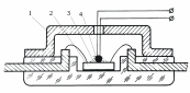 Рис. 4. 6. Схема расположения термопары при измерении температуры в зоне спая: 1 – вывод ИС, 2 – термопара, 3 – припой, 4 – контактная площадка, 5 – диэлектрическая основа. |