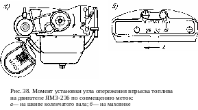 4. Установка угла опережения впрыска топлива для двигателей ЯМЗ-236 производится по совмещению меток на шкиве коленчатого вала и крышке шестерен распределения (рис. 38, а), а также меток на маховике и его картере (рис. 38, б). При этом должны совместиться метки на торце муфты опережения впрыска с риской на указателе крышки ТНВД. Установочный угол опережения должен быть 21° (для ЯМЗ-238—14°). Его регулировка производится поворотом муфты за счет овальных отверстий на фланце полумуфты при отпущенных гайках их крепления. На двигателе ЯМЗ-740 угол опережения впрыска топлива определяется фиксатором и отверстием на маховике. При их совпадении метка на ведущей полумуфте привода ТНВД должна быть в верхнем положении и совмещаться с риской на корпусе насоса. Установочный угол опережения впрыска 18°, регулировка производится аналогично.