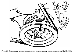 вывернуть свечу первого цилиндра и установить коленчатый вал в положение, при котором он перейдет в. м. т. такта сжатия на 4°; при этом риска на шкиве коленчатого вала должна перейти центральную риску указателя в. м. т. на 4 деления (рис. 49);