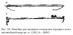 Линейка модели К463 (рис. 58, б) — реечная телескопическая, универсальная с барабанным указателем, предназначена для проверки схождения передних колес грузовых и легковых автомобилей. Точность измерения схождения ±0,5 мм, длина линейки 1880—1040мм (в разжатом и сжатом состоянии), диапазон шкалы от +20 до —6 мм.