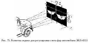 Включить ближний свет фар и, закрыв одну из фар, отрегулировать с помощью винтов горизонтальной и вертикальной наводки положение оптического элемента автомобиля ЗИЛ-4331 таким образом (рис. 75), чтобы горизонтальная ограничительная линия освещенного и неосвещенного участков совпала с линией X—X, а наклонные ограничительные линии, направленные вверх под углом 15°, исходили из точек 0 и максимальное смещение вершины угла от точки 0 к краям экрана не превышало 150 мм.