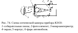 Правильность положения фары 6 определяется по направлению ее светового потока. Пучок света фары, посланный в оптическую камеру прибора, фокусируется линзой и проецируется на экране в виде светового пятна, по положению которого судят о направлении светового потока. Сила света фары оценивается по силе тока, полученного в результате преобразования фотоэлементом световой энергии в электрическую и зарегистрированного микроамперметром.