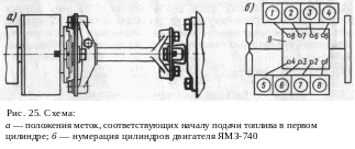 Первое положение для обоих двигателей определяется относительно начала впрыска топлива в первом цилиндре, остальные поворотом коленчатого вала на углы 180, 360 и 540° для двигателя ЯМЗ-740, а на двигателе ЯМЗ-236 через каждые 120°.