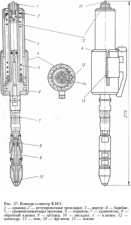 Компрессометр К183 (рис. 27) предназначен для измерения и фиксации на бумажном бланке восьми измерений миксимального давления в конце такта сжатия в дизельных двигателях. В верхней части корпуса подвижно установлен подпружиненный цилиндр 12, воспринимающий давление, а на штоке поршня 6 нанесена шкала. На корпусе, кроме того, установлен вращающийся барабан 4, имеющий восемь фиксированных положений, к которому прикрепляемая бумажный бланк. Отметка давления осуществляется просечкой бумажного бланка встроенным ножом при поворотах барабана в следующее положение. Тарировка компрессометра осуществляетея изменением жесткости пружины 5 цилиндра за счет прокладок 2.