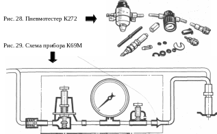 Пневмотестер К272 — переносной, пневматический прибор (рис. 28), предназначен для проверки герметичности надпоршневого пространства цилиндров карбюраторных и дизельных двигателей. Работа прибора основана на контроле величины падения давления сжатого воздуха, подводимого в цилиндр двигателя.