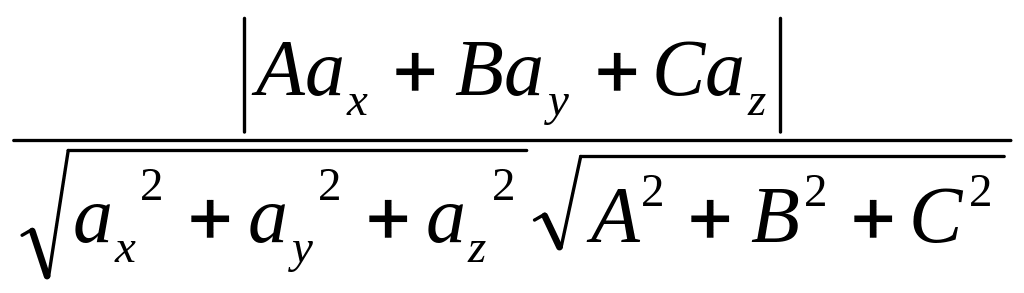 sin=cos. Если нормальный вектор плоскости =(А;В;С) и направляющий вектор прямой =(ах;ау;az), то получаем формулу синуса угла между прямой и плоскостью: