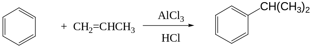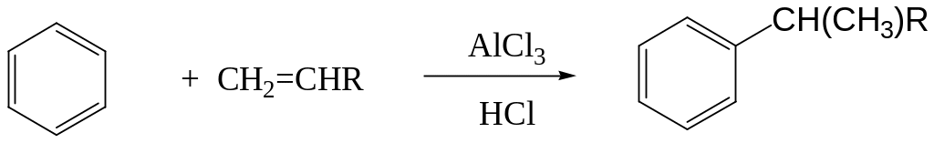 Алкилирование бензола -алкенами (-олефинами) имеет важное значение с точки зрения получения этилбензола, изопропилбензола и длинноцепочечных вторичных алкилбензолов, используемых в производстве алкилбензолсульфонатов. В качестве катализатора используют хлористый алюминий и хлороводород, образующийся из хлористого алюминия при добавлении небольшого количества (~2%) воды. Процесс проводят непрерывным способом либо в каскаде емкостных аппаратов, либо в колонных аппаратах.